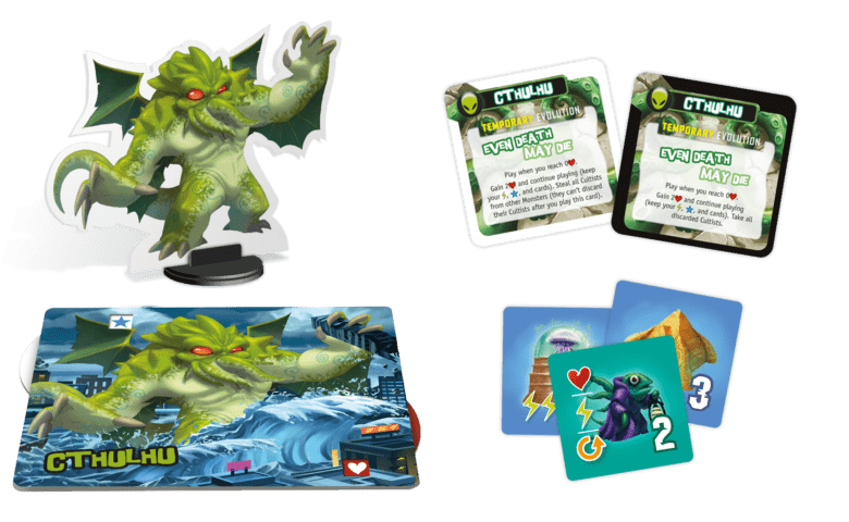 O Monster Pack: Cthulhu inclui um novo monstro, Cthulhu, caso você não tenha adivinhado, além de oito cartas de evolução para usar no King of Tokyo. Você também pode jogar com as peças cultistas, que dão aos jogadores um efeito bônus ao obtê-las!