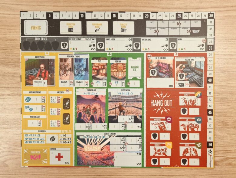 O jogo possui uma produção onírica. Para dar apenas alguns exemplos: o tabuleiro pessoal de cada jogador é projetado como um amplificador, com potenciômetros que funcionam como marcadores e que ajustamos ao longo da partida. Os marcadores de ordem de turno são palhetas de guitarra, e as notas de dinheiro parecem dólares de verdade.